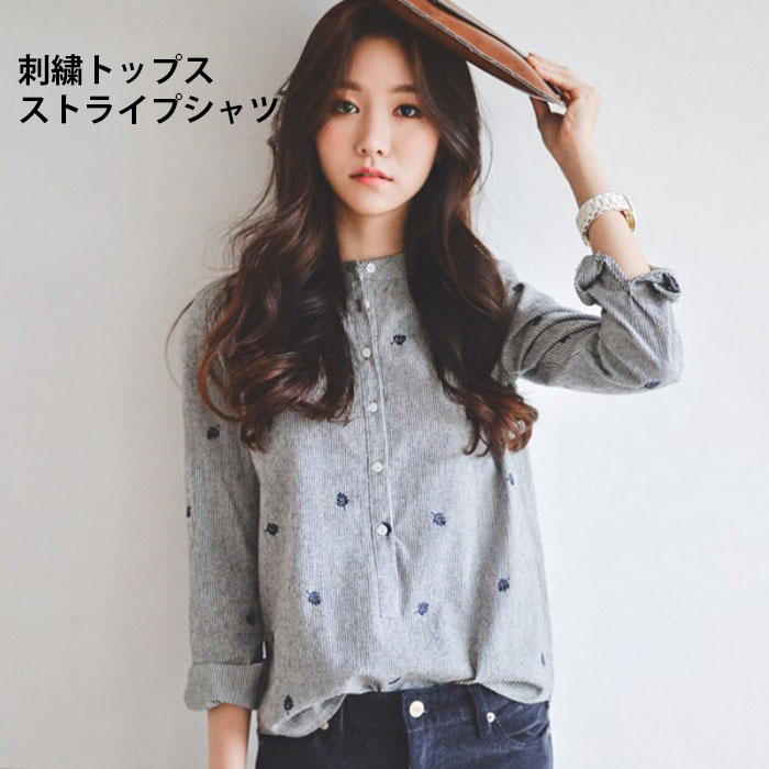 刺繍トップス シャツ レディース 女性 長袖シャツ カジュアルシャツ ストライプシャツ レディースファッション トップス スタンドカラー カレッジ風 刺繍 文芸 かわいい 無地 シンプル ゆったり 送料無料