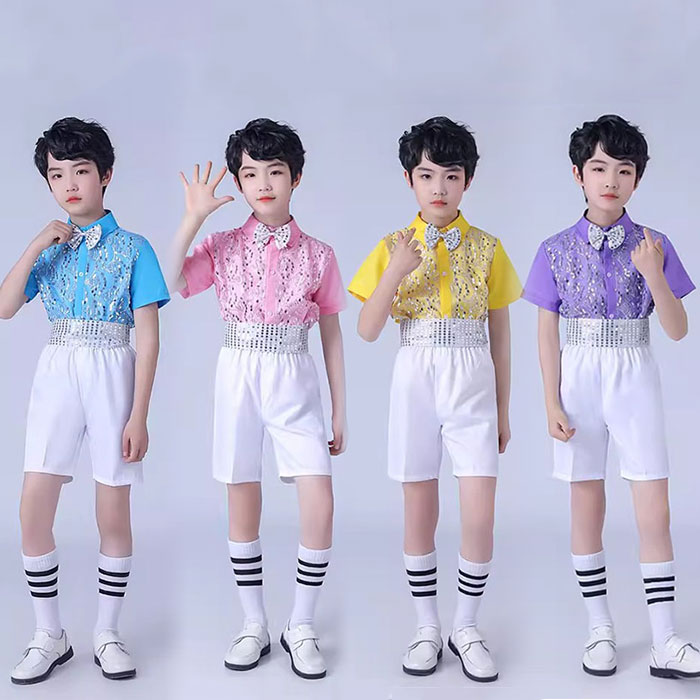 子供服 舞台衣装 男の子 上下セット 9色 半袖シャツ ショートパンツ スパンコール ダンス衣装 蝶ネクタイ キラキラ ダンスウェア 司会者 合唱 団体服 幼稚園 入園 卒業式 イベント 文化祭 ステージ衣装 舞台 子供の日 ダンス衣装 可愛い おしゃれ