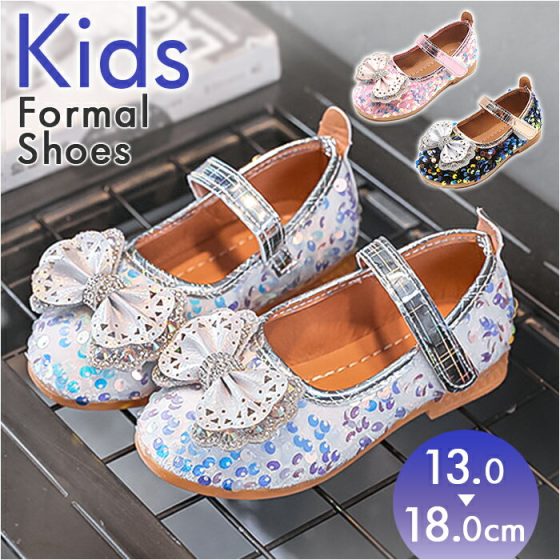 More Details子供女の子用フォーマルパンプス。リボンやスパンコールが可愛い。ピアノ発表会や入学式に最適。