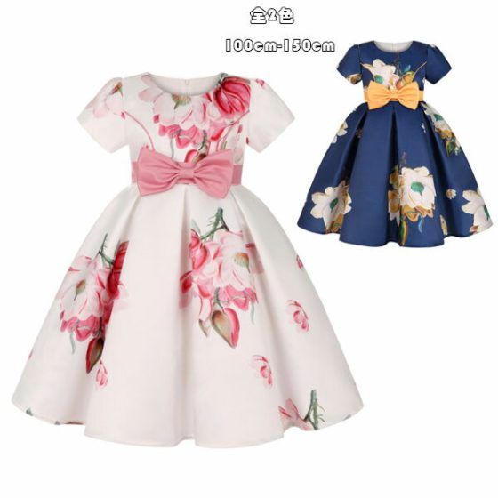 More Details女の子用花柄蝶結びピンクネイビー半袖ドレス。発表会や舞台、お祝いに最適。キ