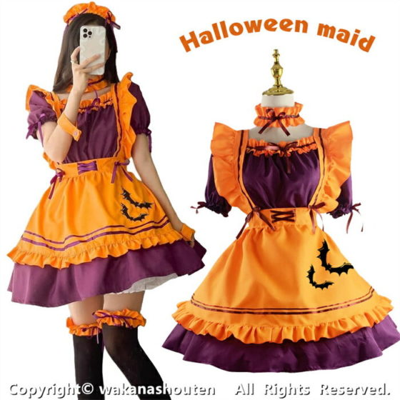 More Detailsハロウィンコスプレメイド服セット。可愛いオレンジコウモリデザイン。大人用。