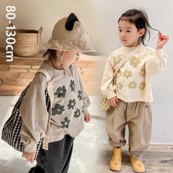 首元レースの白黒花柄ブラウス。パフスリーブで細見え効果。刺繍トップス。韓国ファッ