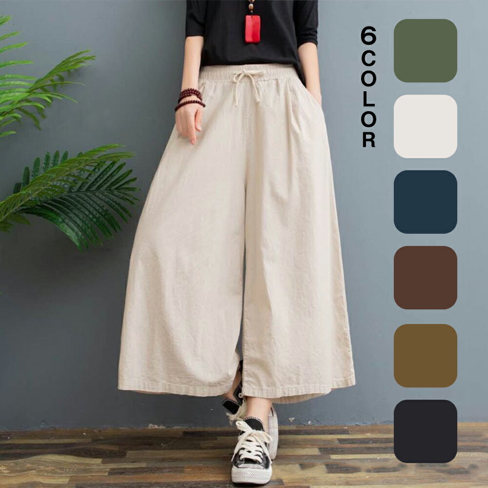 リネン素材のワイドパンツ、6色展開、7分・10分丈、メンズ・レディース用。ウェストゴム、体型カ