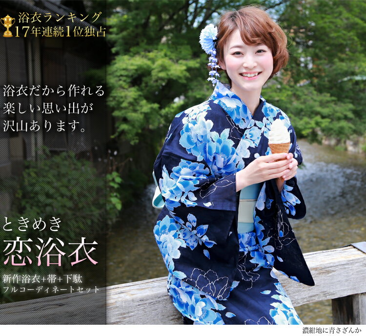 レトロモダン浴衣セット、13柄、ときめき恋浴衣3点セット、朝顔、紺、白、ピンク、赤